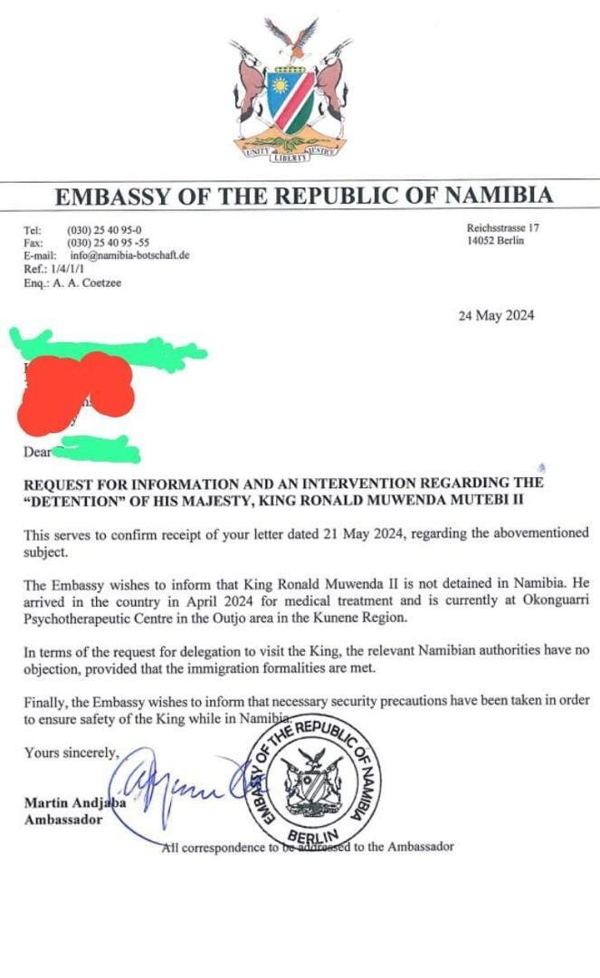 In response to a letter dated May 21 from a concerned Ugandan (names omitted) requesting clarification on rumors that Kabaka is being “held in Namibia,” Namibia’s ambassador to Germany, Martin Andjaba, verified this.