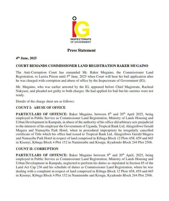 The Anti-Corruption Court has remanded Mr. Baker Mugaino, Commissioner for Land Registration in the Ministry of Lands, Housing, and Urban Development, to Luzira Prison following serious charges of corruption and abuse of office.