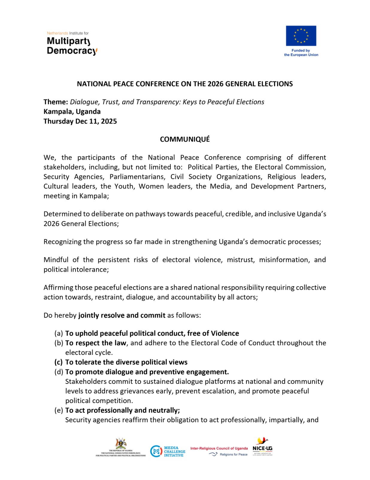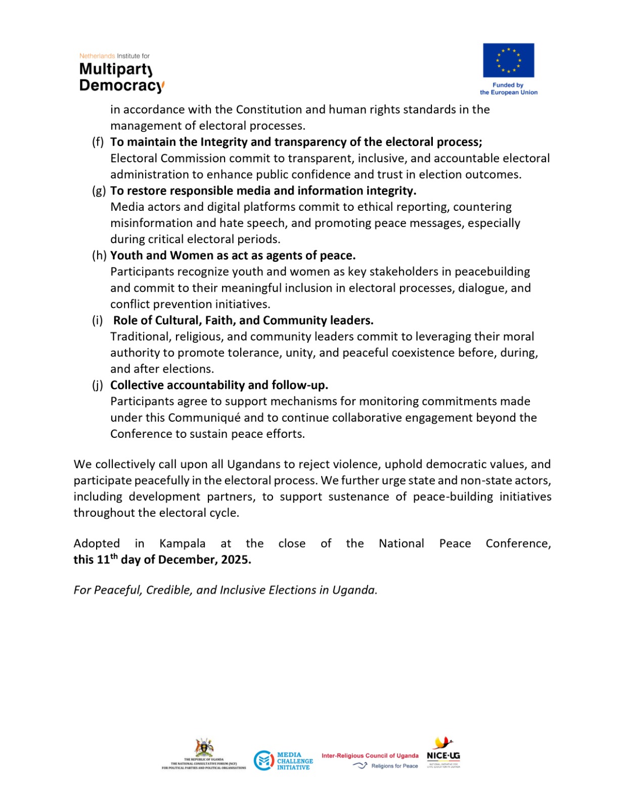 The communiqué was formally adopted in Kampala at the close of the National Peace Conference on December 11, 2025, reaffirming a collective commitment to peaceful, credible, and inclusive elections in Uganda.